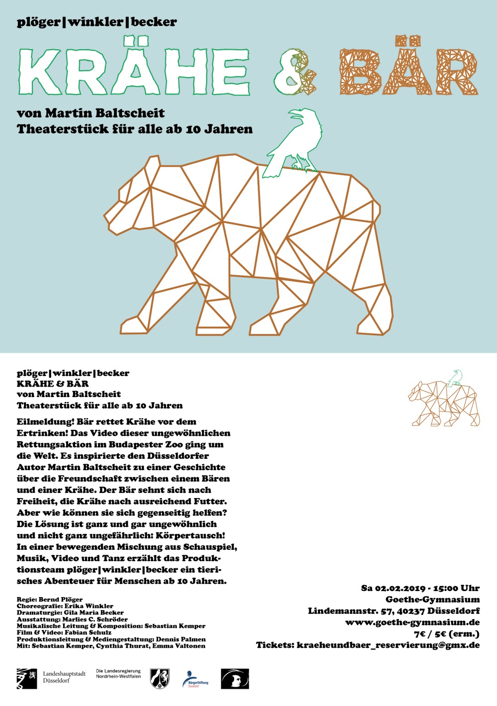 €5 - €7Eilmeldung! Bär rettet Krähe vor dem Ertrinken! Das Video dieser ungewöhnlichen Rettungsaktion im Budapester Zoo ging um die Welt. Es inspirierte den Düsseldorfer Autor Martin Baltscheit zu einer Geschichte über die Freundschaft zwischen einem Bären und einer Krähe. Der Bär sehnt sich nach Freiheit, die Krähe nach ausreichend Futter. Aber wie können sie sich gegenseitig helfen? Die Lösung ist ganz und gar ungewöhnlich und nicht ganz ungefährlich: Körpertausch! In einer bewegenden Mischung aus Schauspiel, Musik und Tanz erzählt das Künstler-Trio plöger|winkler|becker ein tierisches Abenteuer für Menschen ab 10 Jahren.