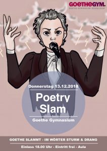 Goethe slammt – im Wörter Sturm und Drang. Zwar slammt er nicht persönlich, aber Schülerinnen und Schüler des Goethe Gymnasiums sind bereit, sich in seine Fußstapfen zu wagen, um die alte Dichtkunst in moderner Form auf die Bühne zu bringen. Am 13. Dezember 2018 lädt die Poetry Slam AG erstmalig zu einem eigens veranstalteten Poetry Slam in der Aula ein.